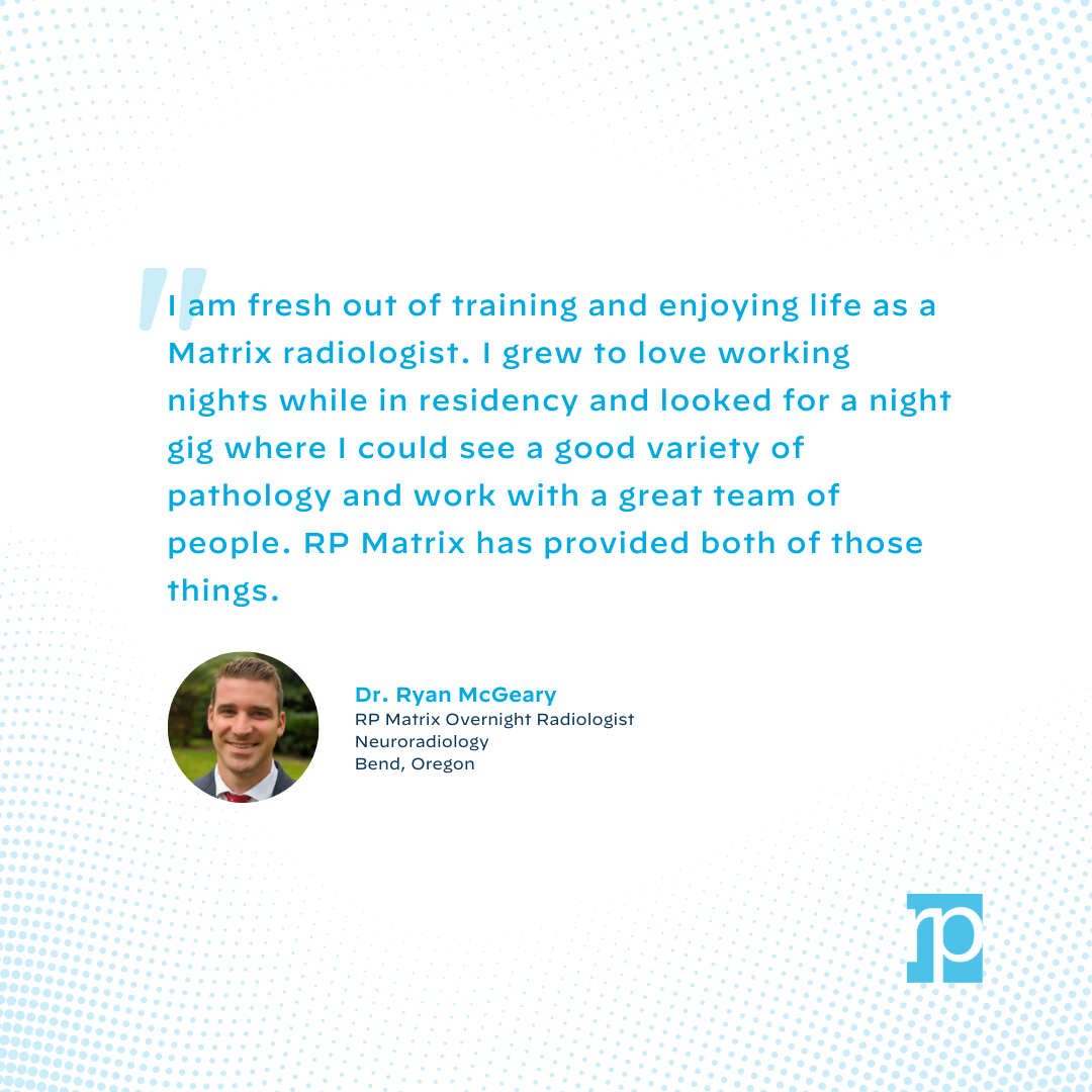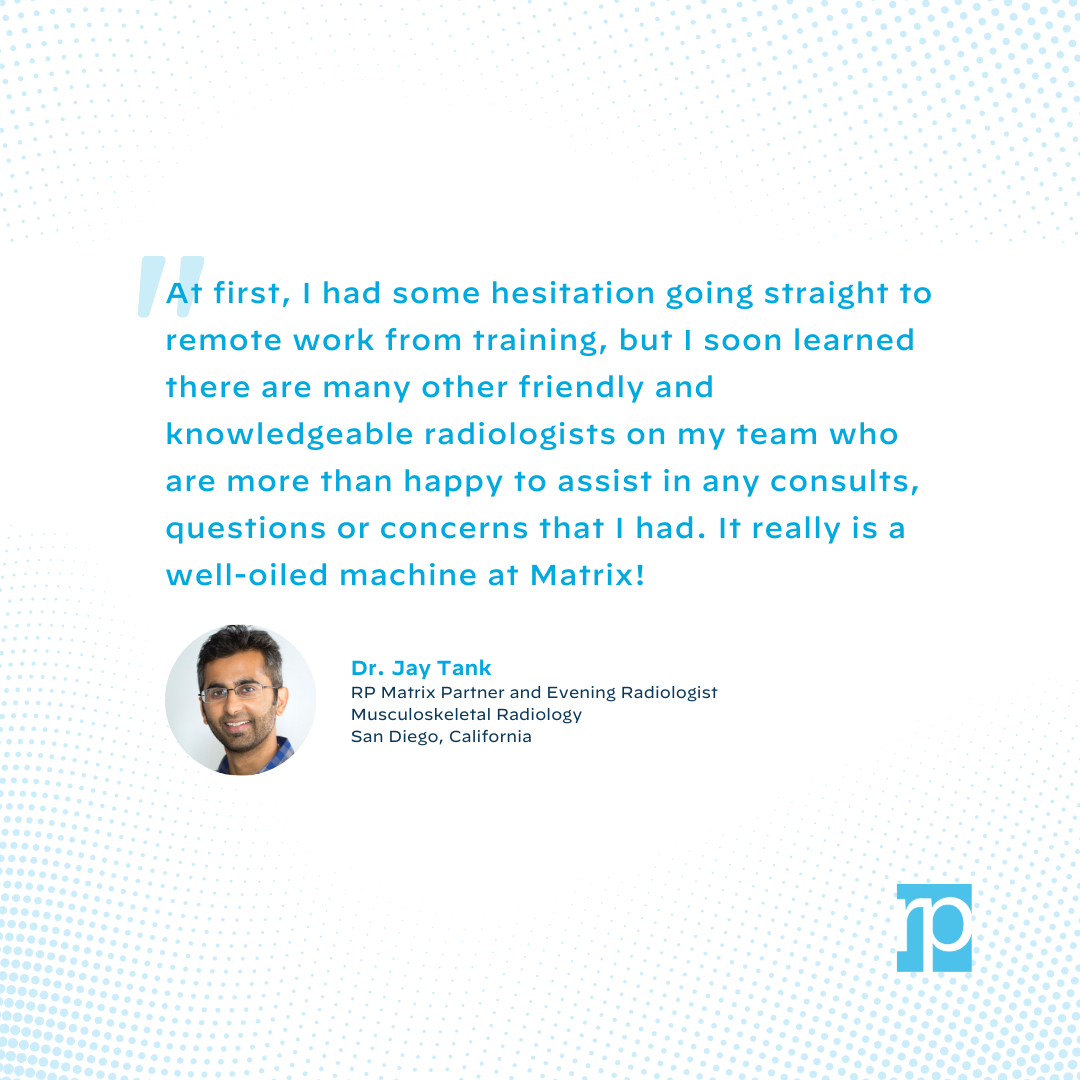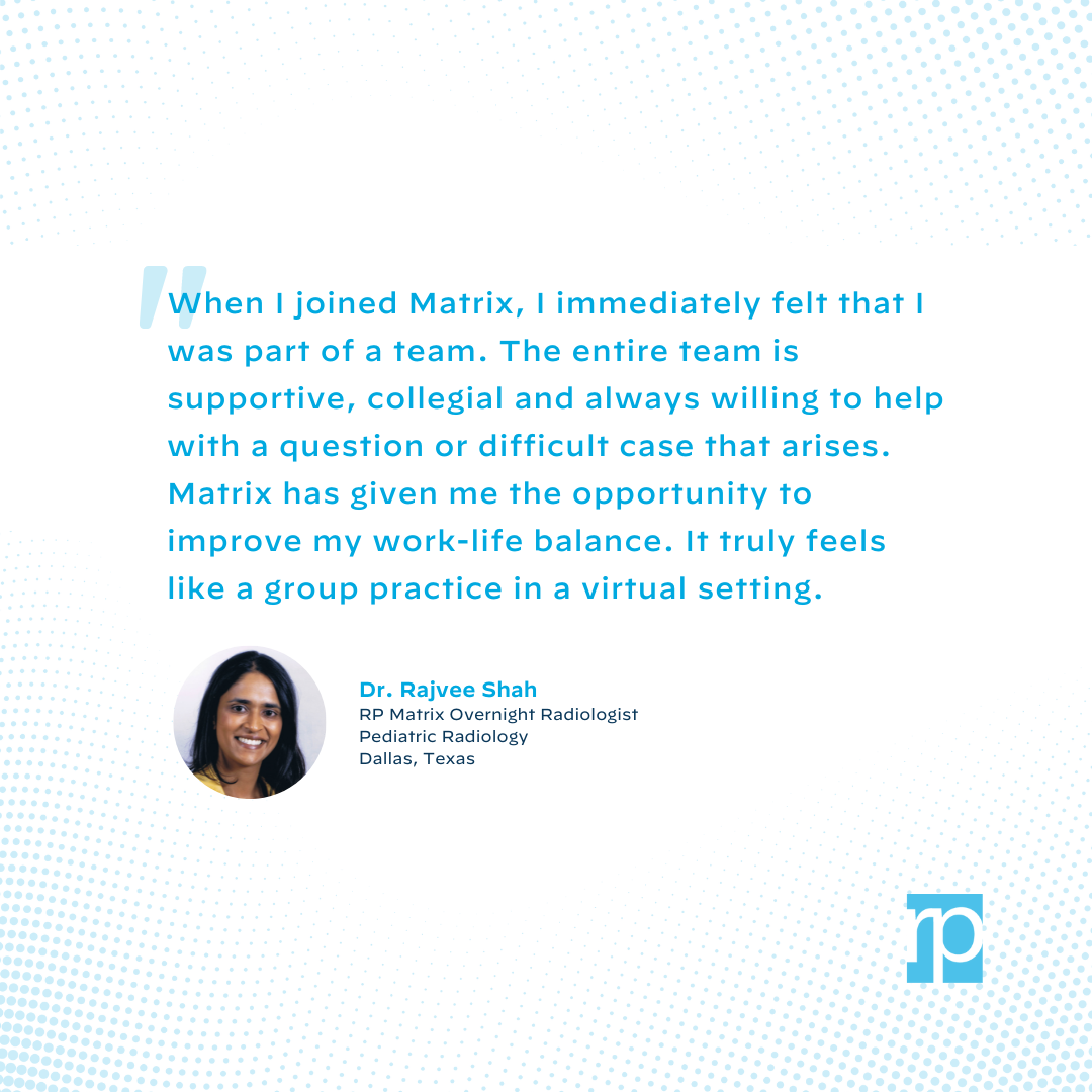 Since then, RP Matrix has grown to more than 150 radiologists strong across the United States. Leveraging a cutting-edge, AI-enabled platform, Matrix supports RP’s practices with remote diagnostic, routine subspecialty, emergent and after-hours imaging support. As part of a large national radiology practice, our Matrix team benefits from the vast scale of RP, which affords investments in multiple areas that allow the entire practice to drive value, such as clinical innovation programs, AI platforms and professional development opportunities. Due to the nature of our services, we are often involved in the piloting of new AI technology, so our practice can tap into the latest innovative tools first. It’s an exciting place to be!