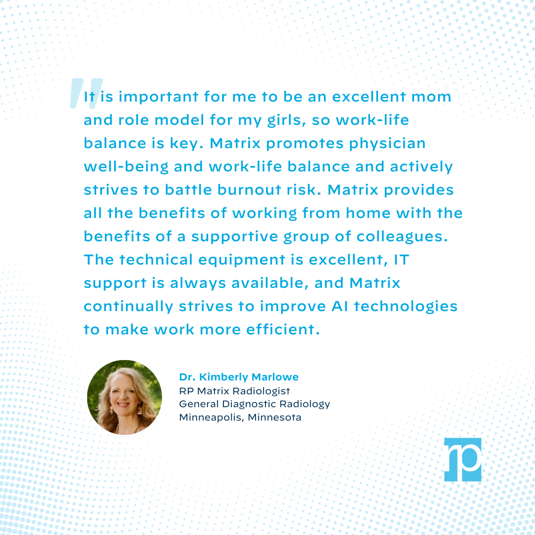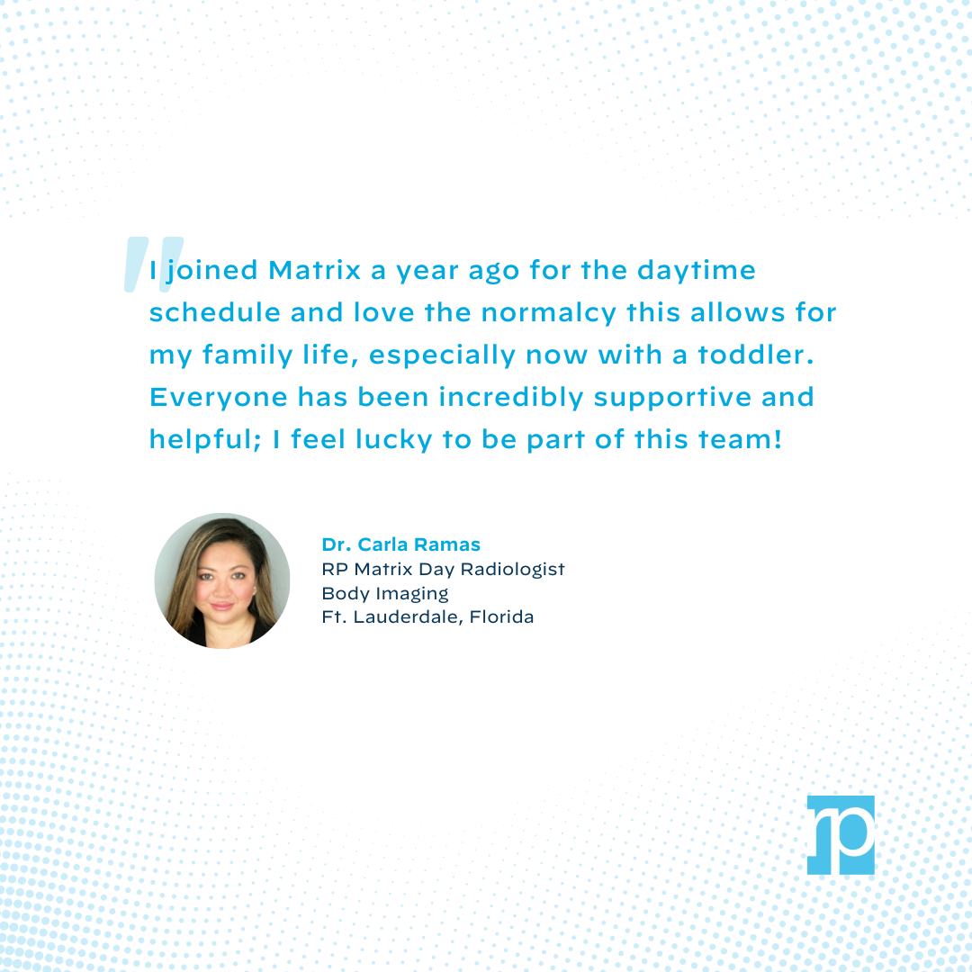 Additionally, teleradiologists can maintain healthy work-life balance by reading remotely from home while enjoying a flexible schedule, offering the ability to spend more time with family and friends or pursue new hobbies. RP Matrix radiologists work every other week or seven days on/14 days off.