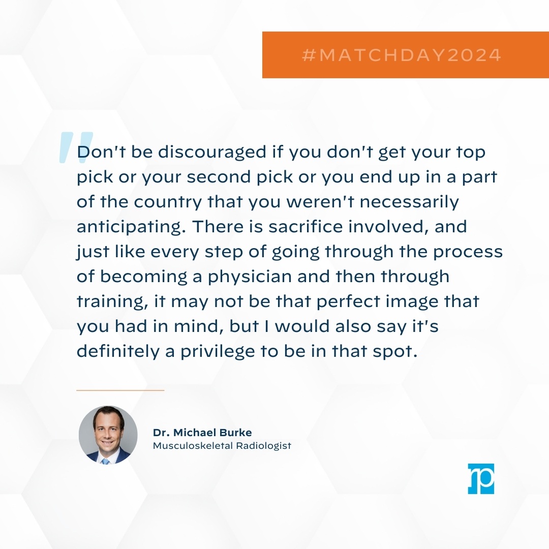 Dr. Michael Burke, Musculoskeletal Radiologist: “Don’t be discouraged if you don’t get your top pick or your second pick or you end up in a part of the country that you weren’t necessarily anticipating. There is sacrifice involved, and just like every step of going through the process of becoming a physician and then through training, it may not be that perfect image that you had in mind, but I would also say it’s definitely a privilege to be in that spot.”