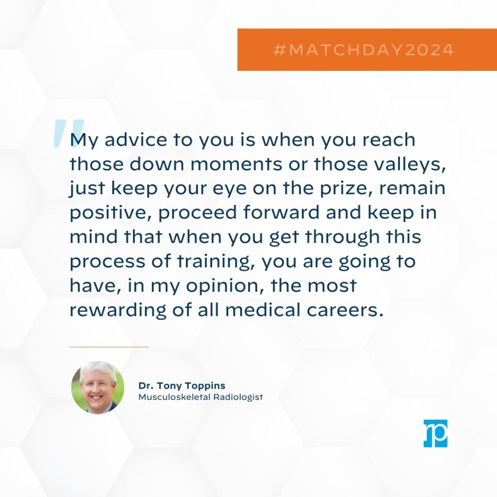 Dr. Anthony Toppins, Musculoskeletal Radiologist: “My advice to you is when you reach those down moments or those valleys, just keep your eye on the prize, remain positive, proceed forward and keep in mind that when you get through this process of training, you are going to have, in my opinion, the most rewarding of all medical careers.”