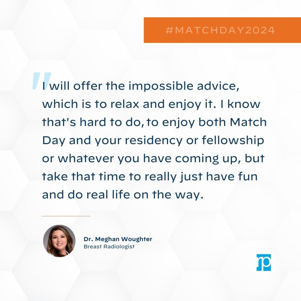 Dr. Meghan Woughter (X), Breast Radiologist: “I will offer the impossible advice, which is to relax and enjoy it. I know that’s so hard to do, to enjoy both Match Day and your residency or fellowship or whatever you have coming up … but take that time to really just have fun and do real life on the way.”