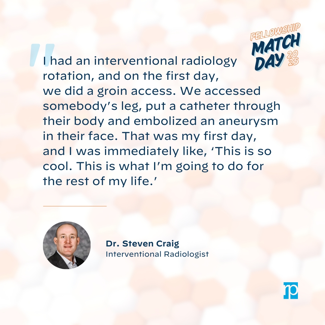 Dr. Steven Craig (LinkedIn), interventional radiologist: “I completed a couple of surgical rotations and was starting to question whether I should be a surgeon or if I was going in the right direction. Then I had an interventional radiology rotation, and on the first day, we did a groin access. We accessed somebody’s leg, put a catheter through their body and embolized an aneurysm in their face. That was my first day, and I was immediately like, ‘This is so cool. This is what I’m going to do for the rest of my life.’”