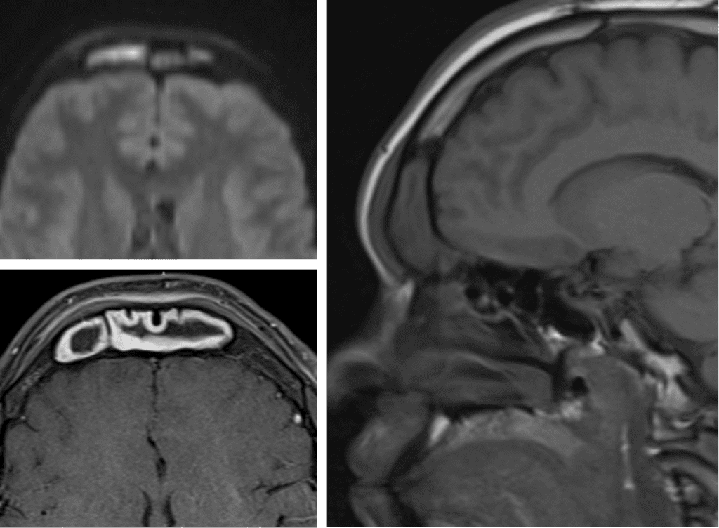 Subperiosteal abscess related to extension of acute frontal sinusitis through the calvarium.
