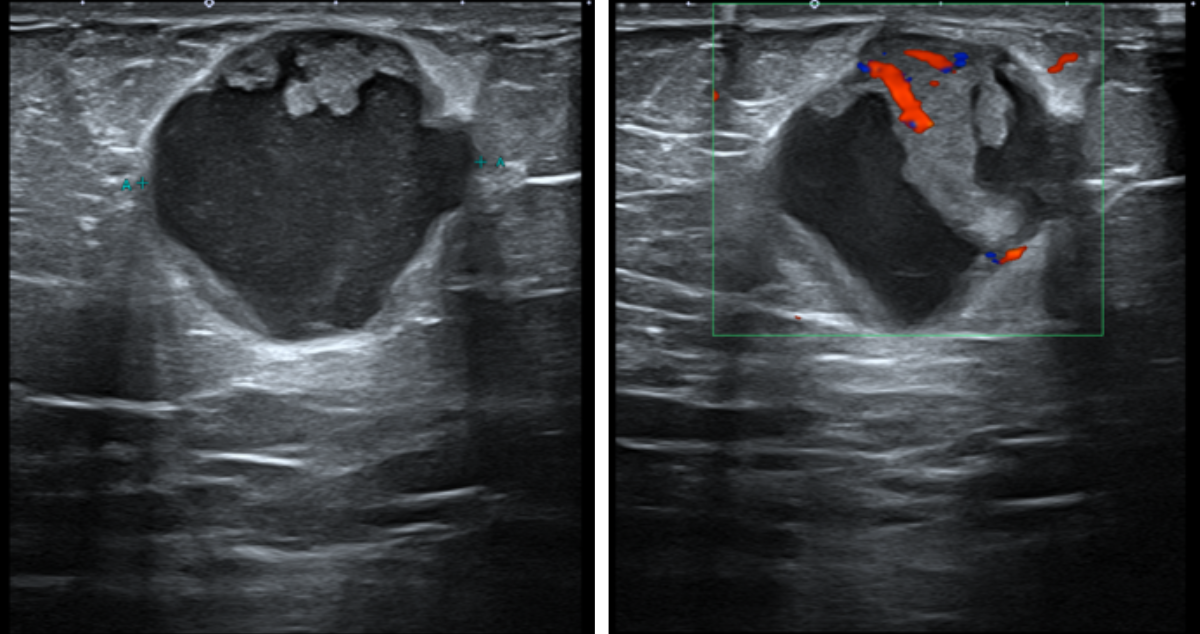 US typically shows a hypoechoic solid mass with variable posterior acoustic properties and often increased vascularity on Doppler.